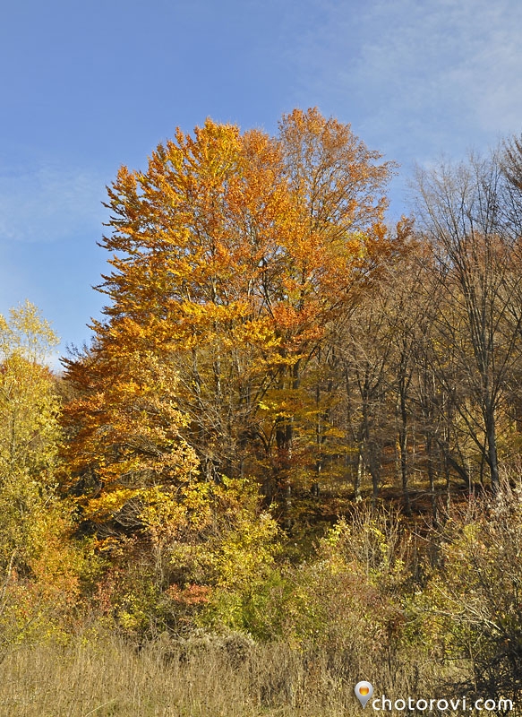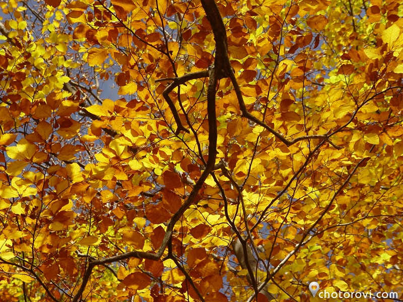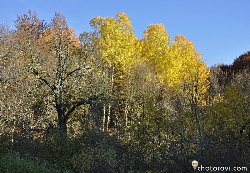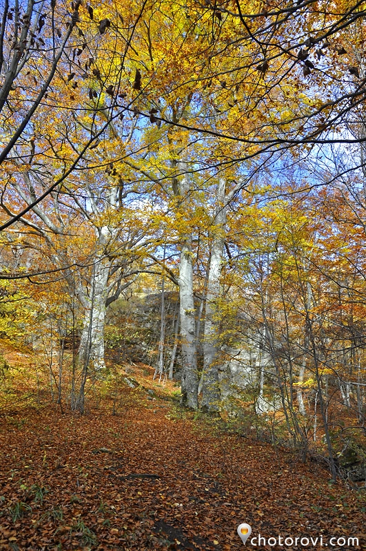 Вървейки надолу в мен все повече се загнездва мисълта, че явно сме били мнооого грешни 😳 (всеки посетил този ден извора е видял течащата вода, а докато ние бяхме там – нито капка) и че ще трябва да предприемем сериозни мерки в посока на пречистването ни, след което да повторим опита. Въпреки бодрото темпо, което налагам не мога да се въздържа да не направя няколко снимки на обляните в последните слънчеви лъчи дървета. Усещането е, че самите те излъчват светлина и багрите им са още по-ярки от обикновено.
