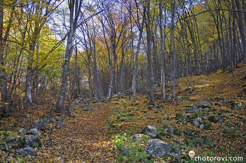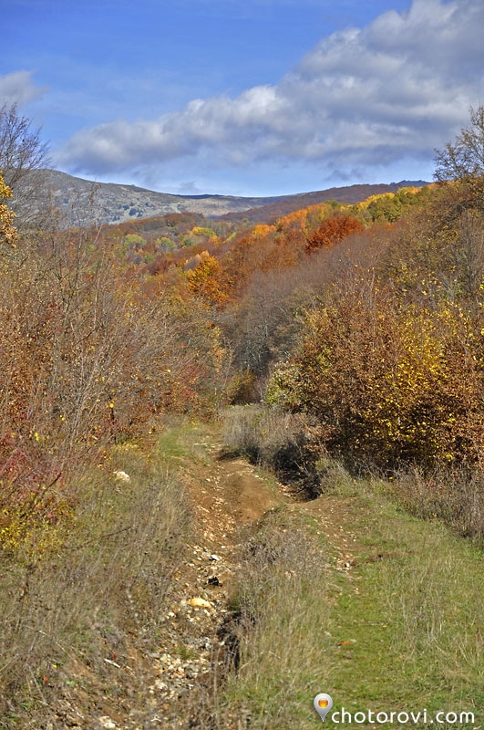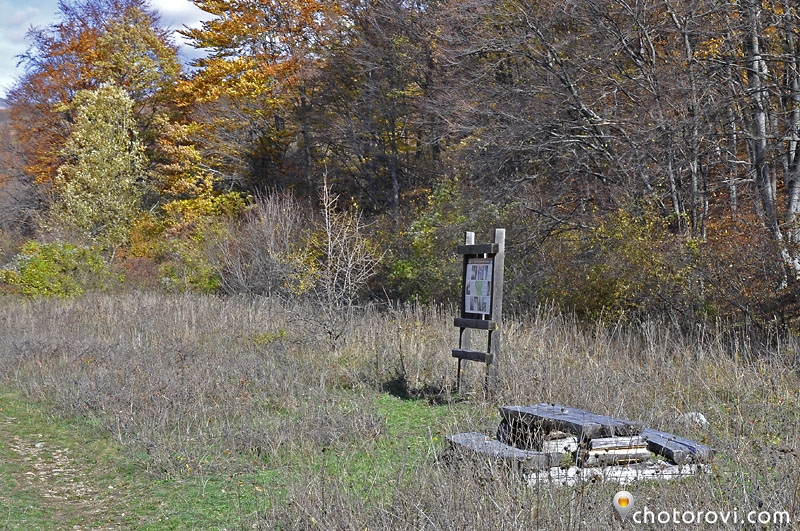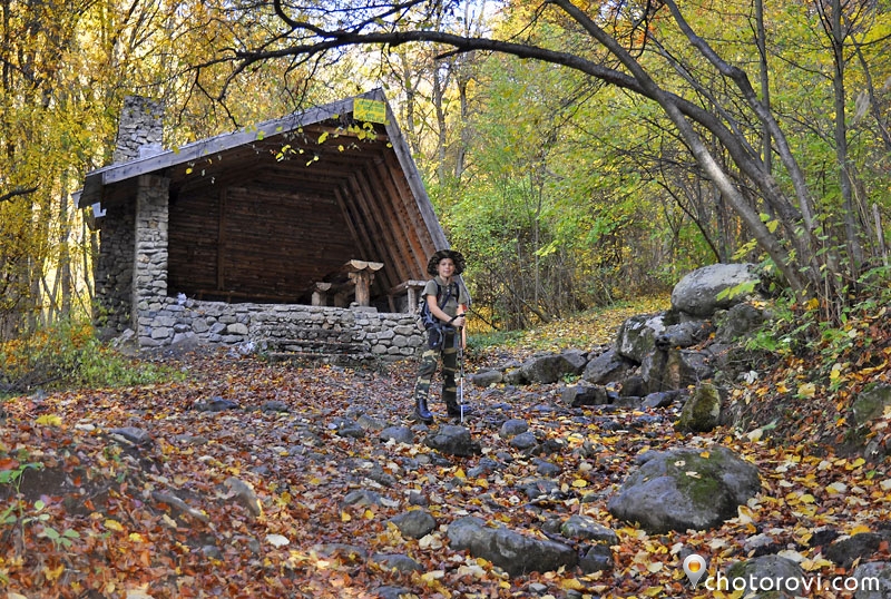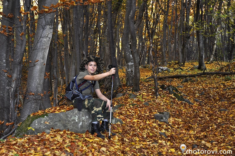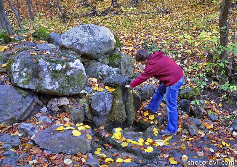 По информацията от указателната табела ни остават още 300 м. Тук срещаме голяма весела компания, от тъй наречената „Трета възраст“ 🙂 , седнала да отмори и похапне. От далеч си личи, че групата е съставена от опитни планинари. Поздравяваме се весело, както изисква обичая в планината (нещо отдавна забравено в нашите планини) и те започват разпалено да ни разправят, как идват от „извора“ и до преди малко водата е текла буйно и продължително. Не губим повече време и навлизаме в в есенната гората,криеща крайната ни цел.