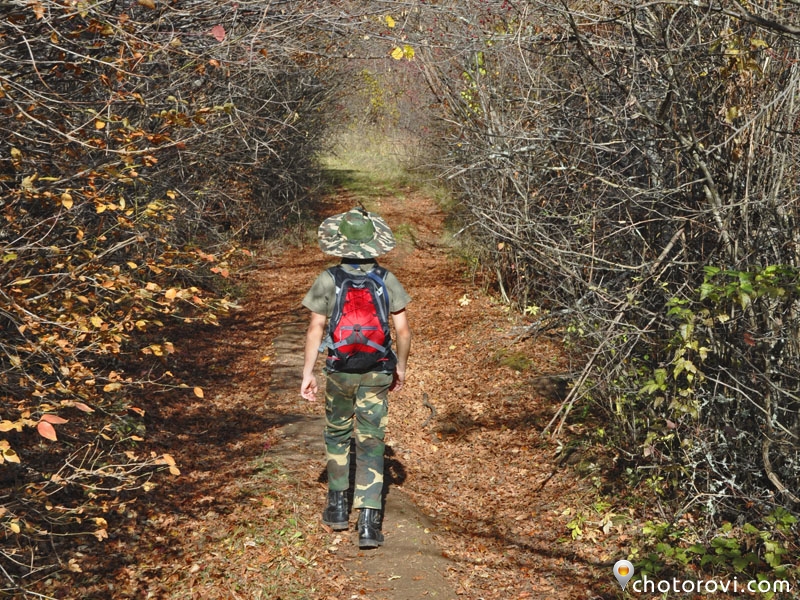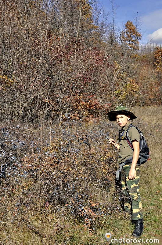 Правилният отговор е: „Трънки„. Целият път буквално е посинял от двете страни от многобройни отрупани с плод храсти. Придвижвайки се бавно в ритъма трънка-снимка-трънка-снимка, достигаме до обширна поляна, където пътя се разклонява. Едната пътека води към заслона и пещерата „Живата вода“, другата се откланя към заслон „Меча чешма“ и с. Кладница.