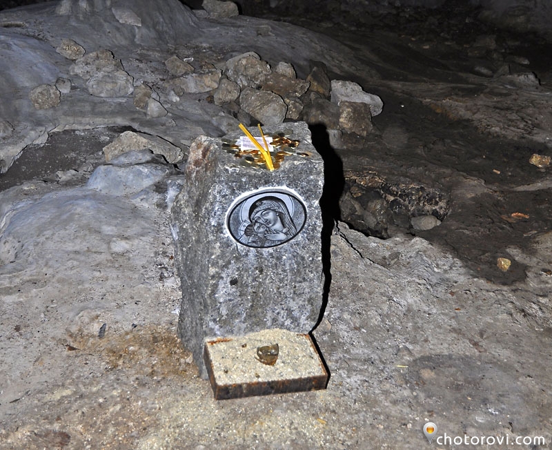 В дъното на предверието местните са поставили камък с лика на богородица. Върху камъка има оставени църковни свещички и импровизирана „каса на доверието“. При ширещия се в последно време вандализъм съм впечатлен и приятно изненадан, че мястото е поддържано, а касата необрана. Това поражда някаква слаба надежда, че не всичко е загубено и може духовността да победи наглостта и паразитирането.
