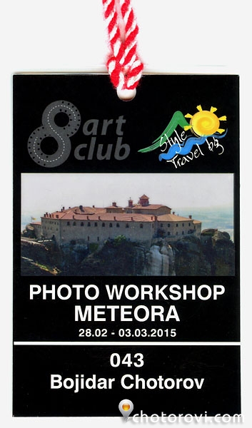 След около 40 минути стъпваме на магистрала “Струма” и ръководителят на групата се заема с първата точка от програмата: “Акредитацията на участниците в пленера”. Както си му е реда, всеки куфар трябва да си има транспортен етикет, та и аз получавам стилно изработен в духа на наближаващият 1 март бадж придружен с плик с рекламни материали, карта на Метеора и кратко описание на един от обектите в програмата – гробницата на Филип II Македонски във Вергина. Вече имам какво да чета и с какво да уплътня част от времето. Зачитам се. Спътникът ми също е разгънал фотографско списание и се е потопил в съдържанието му.