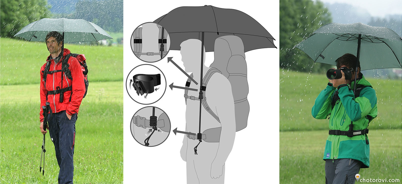 Отварям чадъра и го прикрепвам към хитроумно пригодените носачи тип „свободни ръце“ на фото раницата, заимствани от рекламна публикация от преди години.