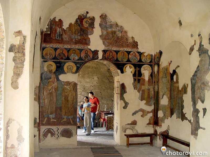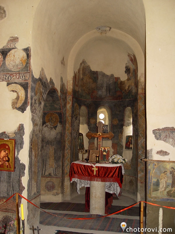Във вътрешността стенописите (или по-скоро запазената част от тях) впечатляват с детайлността на рисунъка.