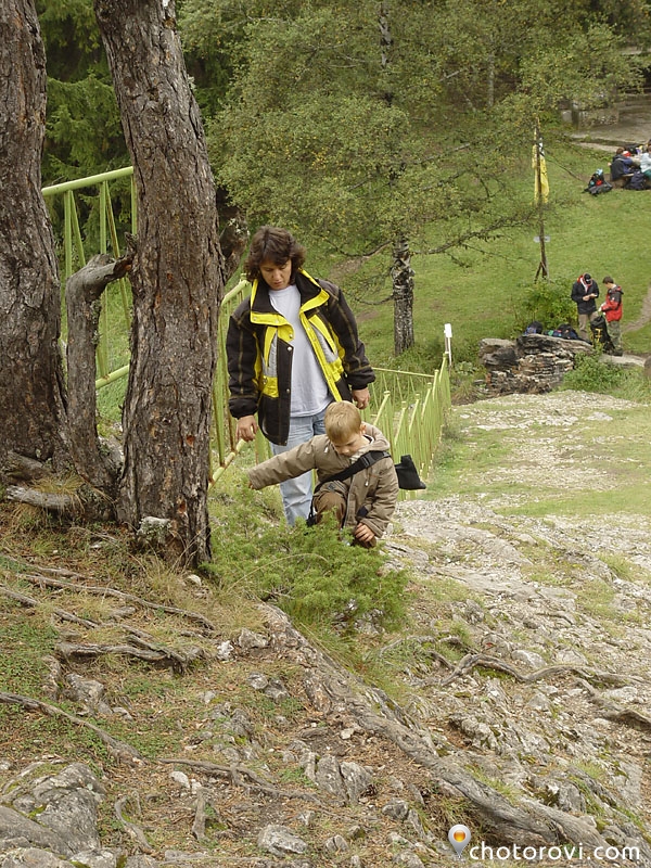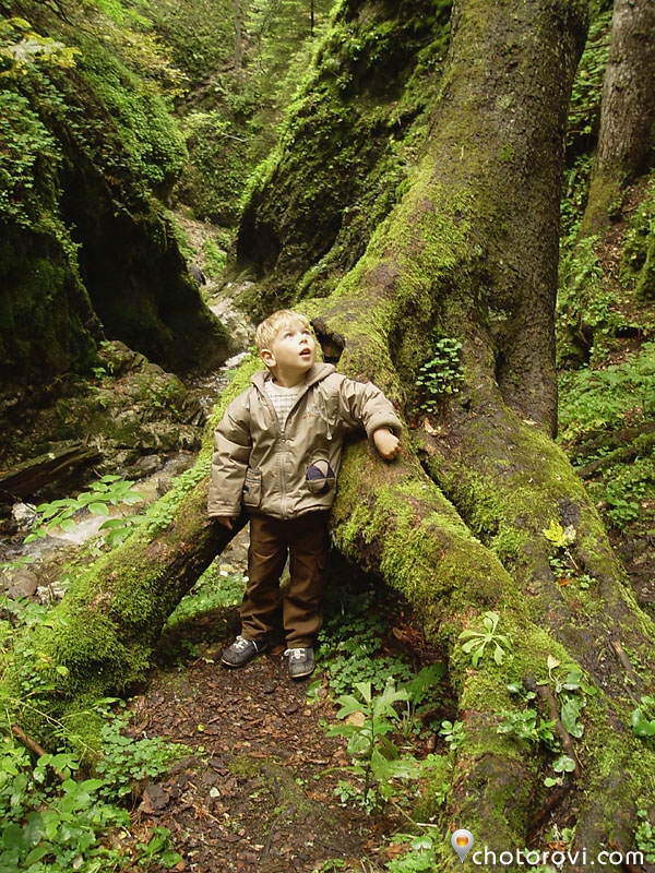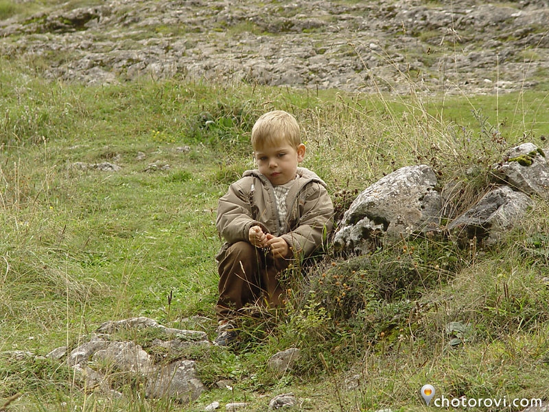 Изкатерваме се по склона над мястото, където реката изчезва под земята. Малкият турист е много ентусиазиран. 🙂